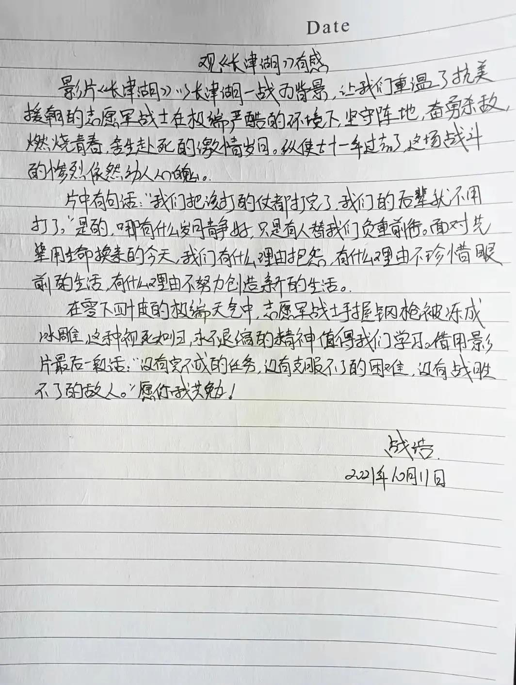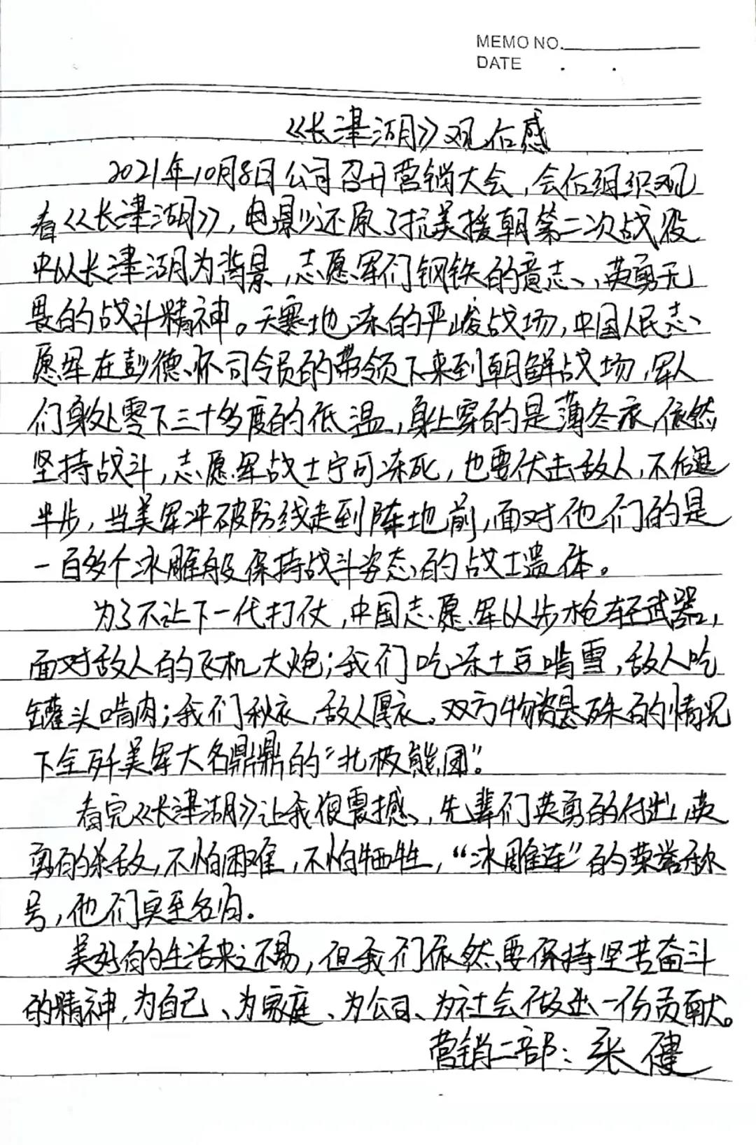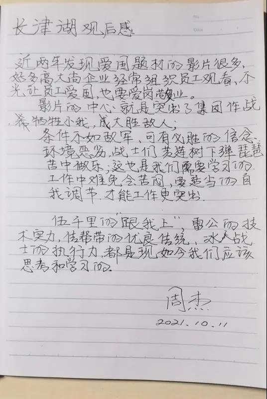 此次觀影活動是一次初心使命的重溫之旅,員工被影片中志愿軍的滿腔熱血和錚錚鐵骨所觸動,紛紛表示:當(dāng)下的幸福生活是無數(shù)先烈用鮮血和生命換來的,要懂得珍惜和感恩。作為營銷人員,更要繼承先烈們不屈不撓的頑強(qiáng)品質(zhì),遇到問題迎難而上,定好目標(biāo)堅(jiān)決執(zhí)行,要敢于擔(dān)當(dāng),勇于開拓,在平凡的崗位上做出不平凡的業(yè)績,為公司高質(zhì)量發(fā)展做出更大貢獻(xiàn)!