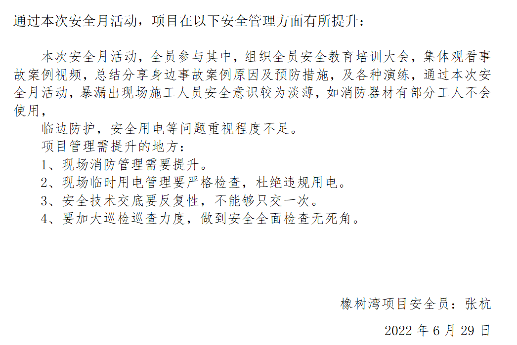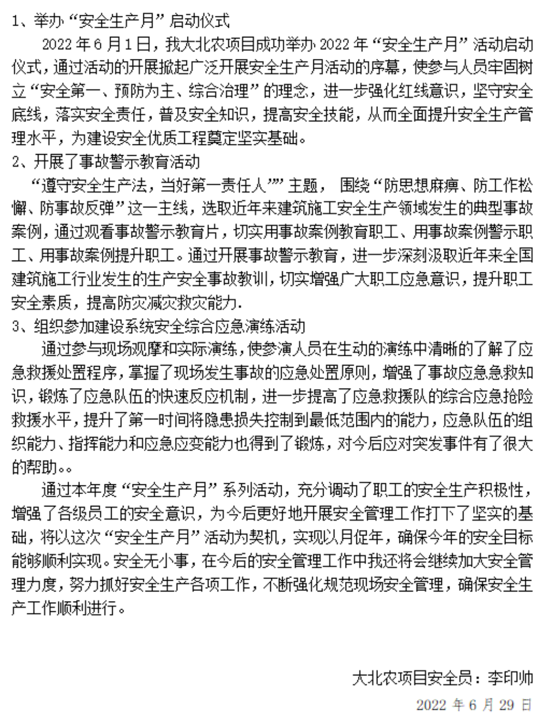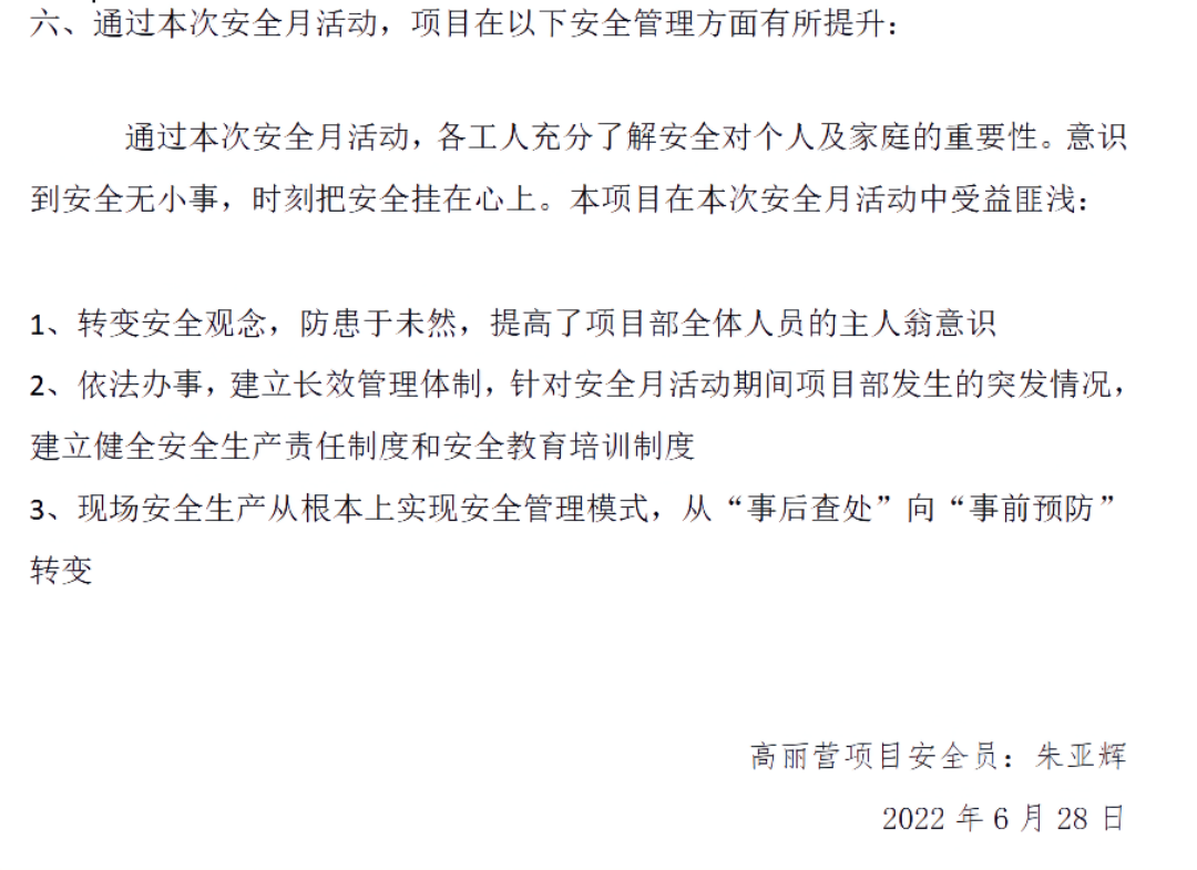 同時,對于“安全生產(chǎn)月”活動中暴露出的問題,各項目部將認真總結和分析,在今后的工作中加以改進,并以"安全生產(chǎn)月”活動為契機,更加嚴格、細致地做好安全工作,為公司的生產(chǎn)運營創(chuàng)造更加穩(wěn)健的安全環(huán)境。