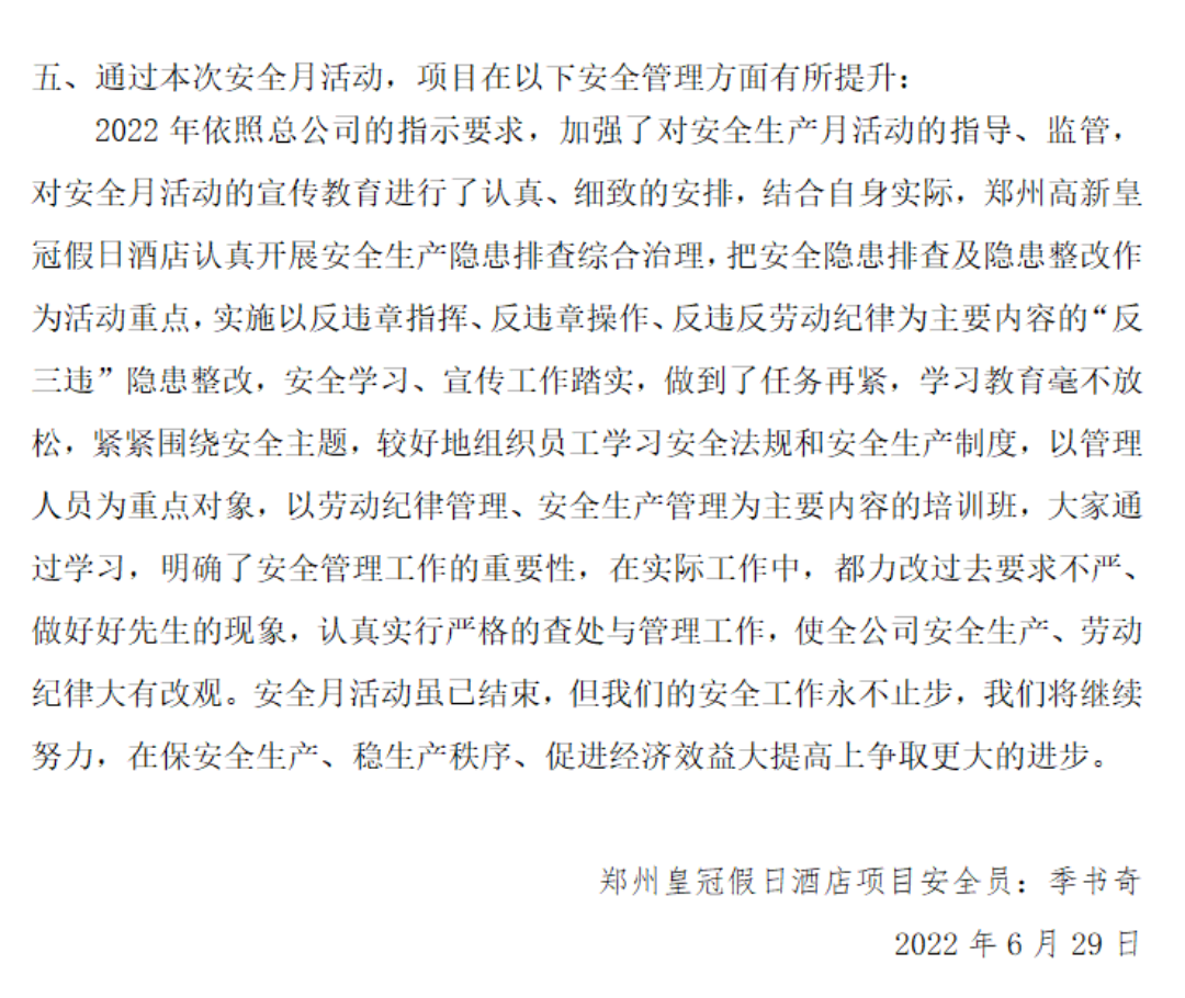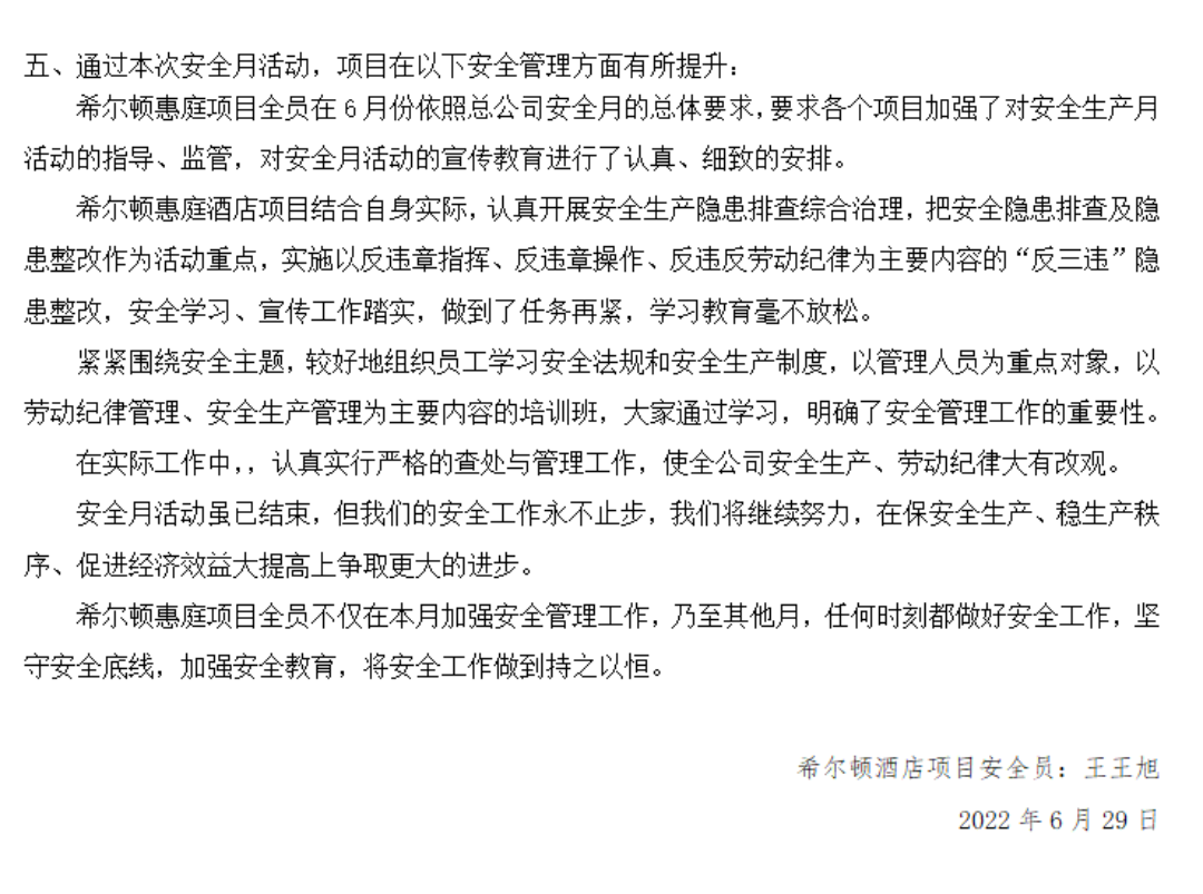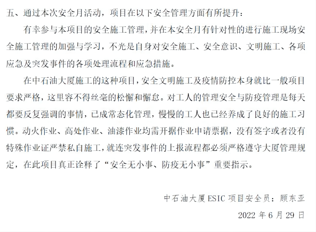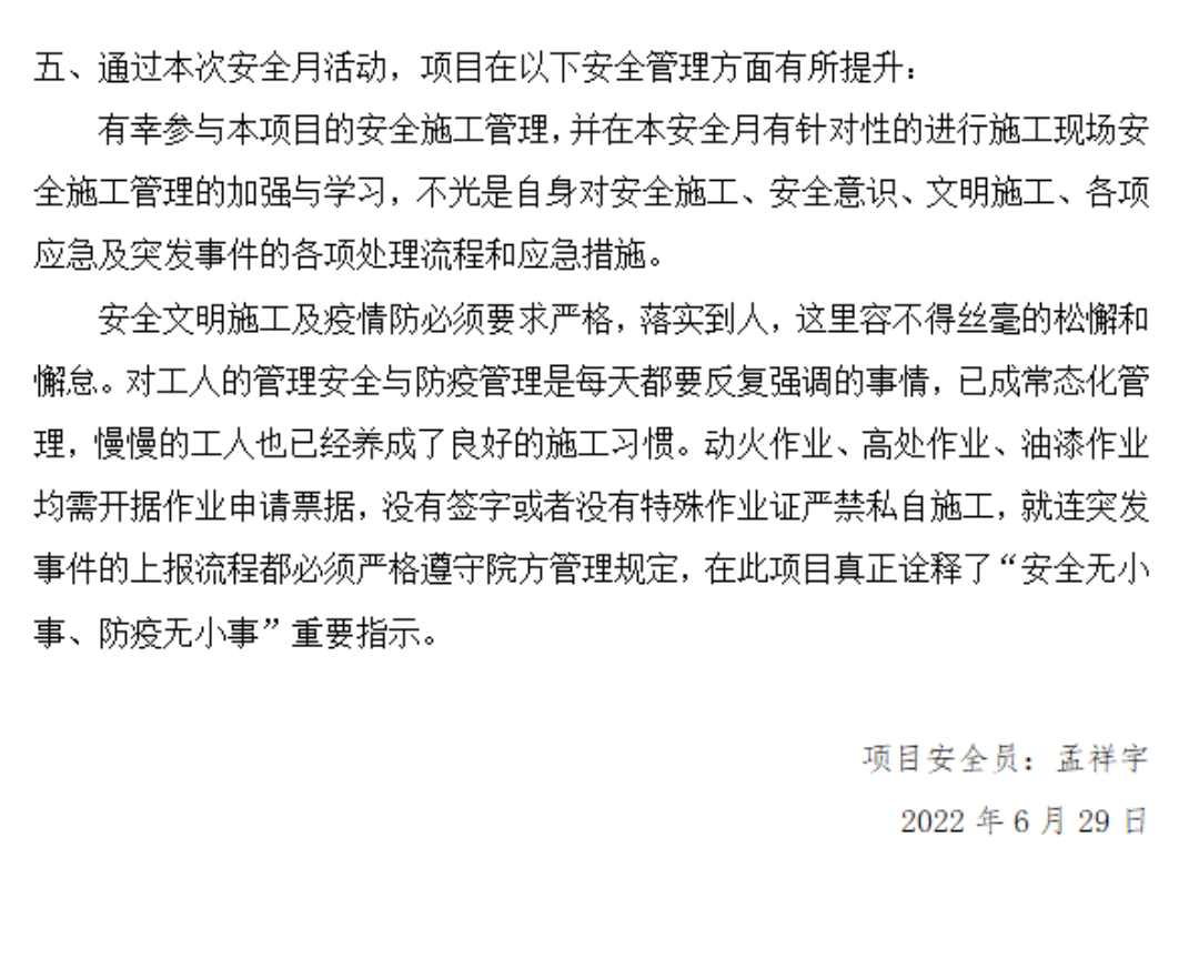 同時,對于“安全生產(chǎn)月”活動中暴露出的問題,各項目部將認真總結和分析,在今后的工作中加以改進,并以"安全生產(chǎn)月”活動為契機,更加嚴格、細致地做好安全工作,為公司的生產(chǎn)運營創(chuàng)造更加穩(wěn)健的安全環(huán)境。