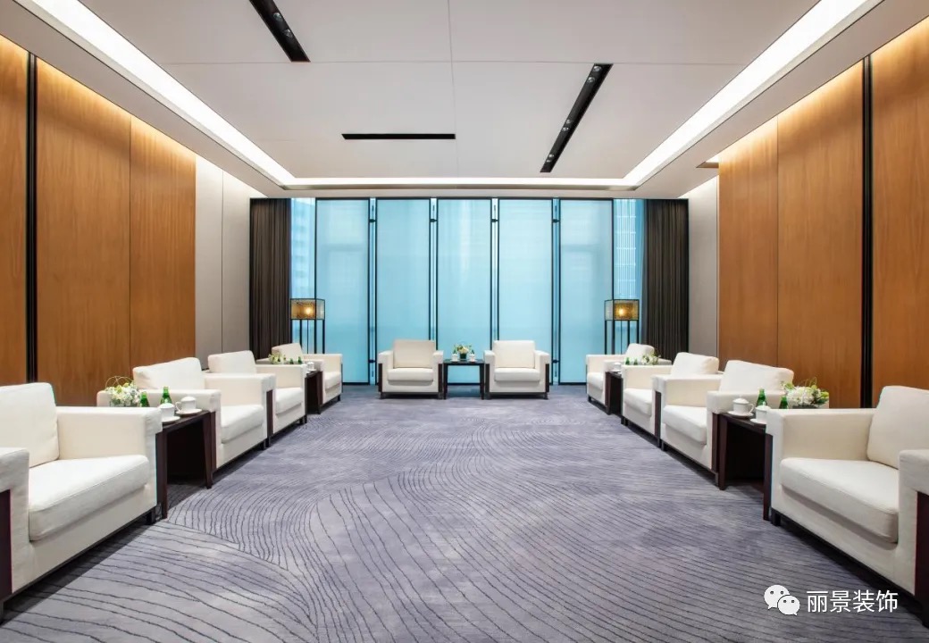 由陽(yáng)光麗景承建裝飾的6間會(huì)議室共1650平方米。其中,880平方米的大宴會(huì)廳,其空間裝飾將金屬與木飾面交融,以剛?cè)岵?jì)之美,演繹簡(jiǎn)潔闊朗的新現(xiàn)代藝術(shù)風(fēng)格。為了更好的體現(xiàn)出會(huì)議區(qū)域的莊重感,施工團(tuán)隊(duì)反復(fù)打樣推敲金屬與木制品的色彩搭配,項(xiàng)目團(tuán)隊(duì)還多次提出合理化建議,以專業(yè)的技能、優(yōu)質(zhì)的服務(wù)得到業(yè)主與設(shè)計(jì)單位的一致好評(píng)。